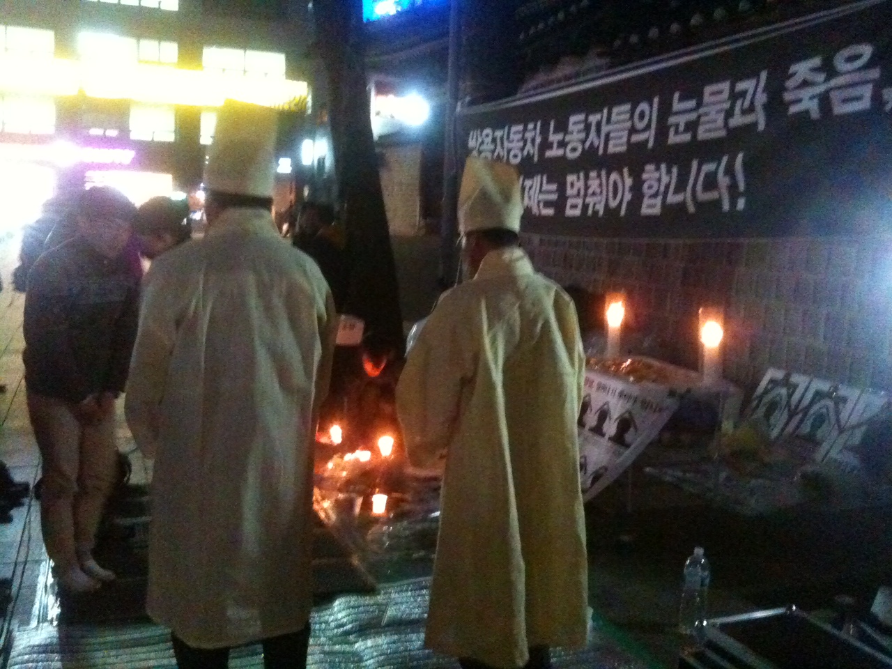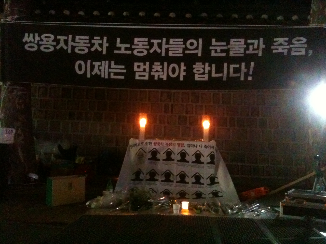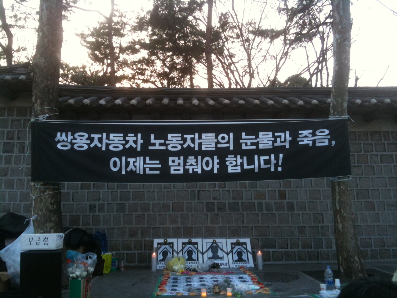 학교를 마치고 집에 오는 길에 대한문 앞 쌍차 분향소에 들렀습니다.옥쇄파업에 참여했던 노동자의 자살은 처음이라지요.심리치유센터 와락에 두번이나 전화를 했다고도 하구요.함께싸웠던 동지에게 쌍차투쟁을 담은 다큐멘터리 <당신과 나의 전쟁>을 보내달라고 했다는...그런 이야기를 전해 들으니, 정말 마음이 좋지 않더라구요.그리고 가족도 없어서 3일 뒤에야 노동조합에 연락이 왔다는 사실도 그렇구요ㅠ >> 대한문 앞 분향소 분향소에서 참배를 하고, 돗자리 위에 앉아 있는데 마침 제 옆에 전태일 열사의 동생이신 전태삼 아저씨(호칭이ㅠㅠ)께서 앉아계셨답니다.저에게 "사람들한테 여기 올 때 꽃 대신 빵을 사오라고 해야 된다" 라며 "정리해고도 빵 땜에 생긴 문제고, 죽음도 빵 때문에 생긴 문제다. 지금 우리가 싸우는 건 빵 때문이다.그런데 꽃을 놓게 되면 문제가 흐릿해져 버려. 그러니까 눈 앞에 빵을 둬야한다" 라고 하시더라구요.들을 때는 그냥 고개를 끄덕였는데, 집에 와서도 계속 생각이 나네요.