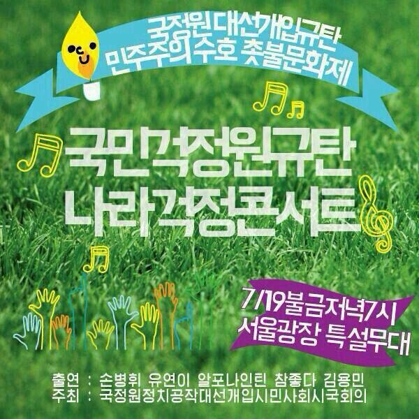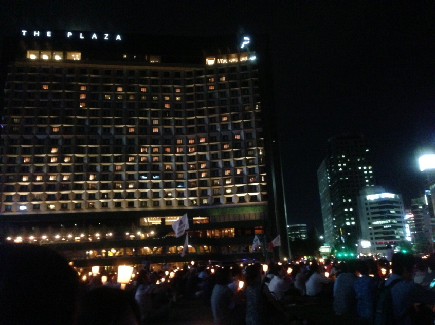 지난 금욜에 국정원 대선 개입 규탄 문화제 다녀왔어요. 사건에 비해 지나치게 조용하고 평온한(?) 우리나라를 이상하게 바라보는 내가 이상한건가 헷갈리는 요즘. 맨 처음 이 이야기가 나올 땐 세상이 뒤집어 지겠구나..라고 생각했는데 속만 뒤집어질 뿐, 뉴스에서는 더운얘기, 비오는 얘기가 헤드라인인 현실. 그러나 이날 꽤 많은 사람들이 서울광장에 모였습니다. 저는 처음 왔지만, 사실 사람들은 계속 외치고 있었다는 사실. 부끄럽네요.. 국정조사가 제대로 될진 모르겠고, 남재준이 해임될지도 모르겠습니다. 그러나 증명된건, 조용하고 얌전할수록 국가는 시민들의 권리를 더 무시했다는 거고, 만만한 시민들을 빽으로 대선개입도 자신있게 했다는 것. 촛불색깔이랑 플라자호텔 객실 불빛색깔이랑 똑같에서 올려봤어요. 볼때마다 괜히 재수없음.ㅋㅋㅋ 돌아오는 토요일 저녁(7/27 오후8시)에 다섯번째 주말집회를 서울광장에서 한다고 합니다. 이날 센터에선 향진원 봉사활동이 있지만 끝나고 시간맞춰 서울광장으로 갈겁니다. 그날엔 많은 회원 여러분과 같이 갔으면 해요!!!