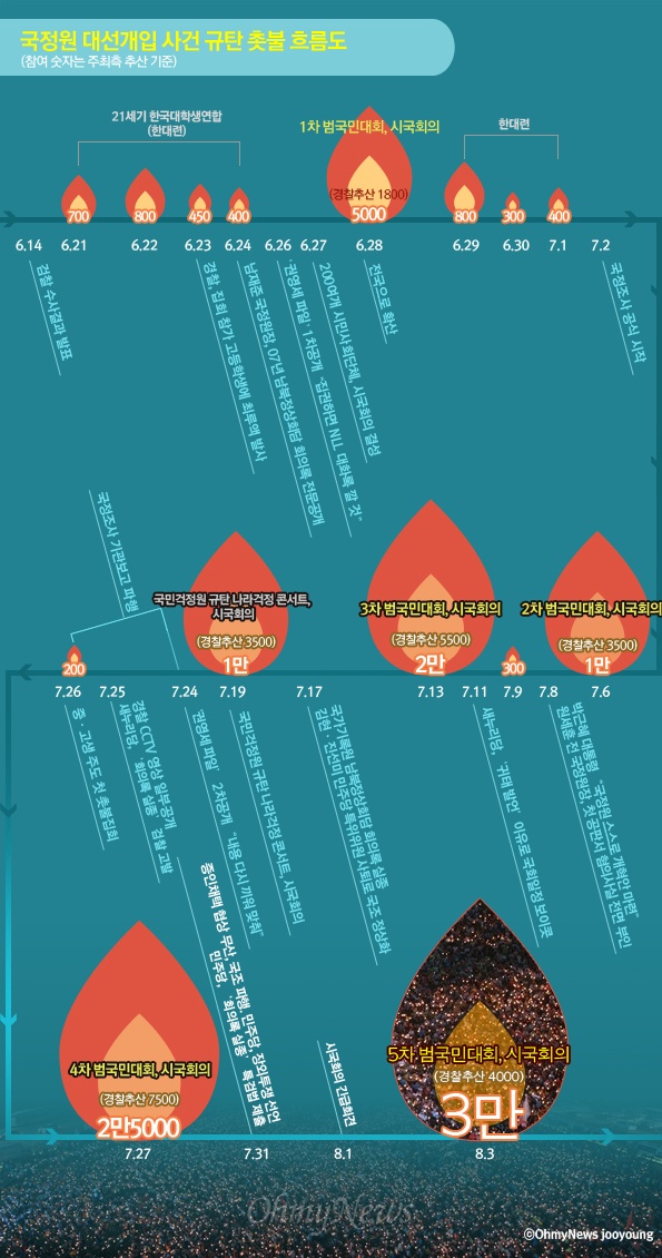 건물 꼭대기에서 찍은 촛불인파입니다. 청계광장이 그 인원을 충원하기가 턱없이 부족해 자리가 없어 못 앉은 사람도 많았습니다. 그동안 촛불집회가 서울광장에서만 열렸기에, 서울광장으로 간 사람도 많았다고 하네요 뉴스에서 본 촛불 흐름도인데요 이번 집회는 무려 3만명이 참석했다 합니다. 6월부터 시작된 촛불이 꺼지기는커녕 점점 더 확산되고 있습니다. 그만큼 정부와 국회에서 제대로 된 국정조사를 하지 않고, 마치 어물쩍 넘어가려는 제스쳐를 보이고 있습니다. 국정조사가 진행되고 있지만! 제대로 진행되고 있지 않기에! 더욱더 화난 시민들이 촛불을 들고 거리로 거리로 나오는 것 같습니다. 다음 집회는 8월 10일입니다. 다른분들도 결합해서 함께 촛불을 들었으면 좋겠습니다~