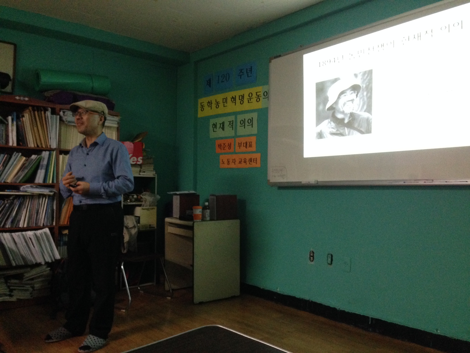 노동자교육센터 운영위원이자 역사학자인 박준성 선생님께 120년 전에 발생한 동학농민혁명이 지금의 우리 삶에어떤 영향을 끼치고 있는지 들어보고자 시민강좌를 준비하였습니다. 2014년을 여는 시민강좌였네요^^ 동학농민운동(혁명) vs 1894 농민전쟁호명이라는 행위가 얼마나 중요한가에 대해 거의 많은 시간을 할애하여 설명해주셨어요.센터에서도 강좌를 준비하면서 "동학농민운동"이라고 불렀는데. 이 말이 120년 전 당시에 싸운 사람들의 상황을, 그리고 구조를 충분히 반영하지 못하고 있다는 것을 지적하시면서 1894년 농민전쟁으로 부르고 있는 이유에 대해 설명해주셨습니다.518민중항쟁을 기득권 세력들은 518폭동, 518사태로 축소 왜곡하여 호명하는 가까운 경험을 들어 "이름을 붙여 부른다는 행위"가 얼마나 중요한가에 대해 짚어주셨습니다. 갑오농민전쟁 뿐만 아니라 앞으로 비슷한 상황들이 벌어질 때 고민하게 될 것 같아요!밥은 하늘이다! 사람도 하늘이다! = 빵과 장미를 달라!역사란 것을 "지나간 것"으로 묻어 두는 것이 아니라 우리의 현재를 살아가는, 그리고 미래를 내다보는 상상력의 근거가 된다고 강의 내내 강조하셨다. 그래서 우리가 역사를 다시 새겨야 한다는 것이다. 고기 잡는 법을 가르쳐 줄 것이 아니라 바다에 대한 동경을 갖게 도와줘야 한다는 이야기를 통해 꿈을 가지고 살아가는 것이 얼마나 소중한 것인가를 다시 한 번 되새기는 시간이었습니다. 그리고 120년 전의 농민들 8000명이 백산에서 김해 만경평야를 내려다보며 가졌을 마음, "땅과 함께 살아가는 우리의 땅이고, 저기서 수확한 것도 다 우리의 것이다" 라는 것을 상상하니 왠지 힘이 불끈 솟기도 했습니다.강의 들으러 오신 많은 분들도 그러셨기를 바랍니다^^다음 강의는 "교학사 역사 교과서 왜곡의 문제점"에 대하여 역사학자 이주한 선생님과 이야기 나눠보도록 하겠습니다.다음주 화요일 4월1일(화) 19:30 에도 많이들 함께해 주세요!!마지막으로 박준성 선생님이 강의 후에 페이스북에 남긴글을 옮기며 마무리 하겠습니다.마르크스는 프랑스혁명을 돌아보며 프랑스혁명 3부작을 쓰고박헌영은 1946년 10월 인민항쟁을 겪고 나서 바로 1894년 농민전쟁, 1919년 3.1운동, 1946년 인민항쟁3대 사건을 분석했다.김남주는 1894년 농민전쟁과 1980년 광주민중항쟁을 연결시켜 "노래"를 썼다."노래"에 1985년 광주의 김경주가 곡을 붙인 것이 "죽창가"이다변혁의 상상력이 고갈되고 변혁의 꿈이 소멸되어갈 때변혁운동의 역사도 방치된다.기념행사 치레용 역사 돌아보기는 마뜩치 않으나올 "갑오년"에 2갑자가 되는 갑오농민전쟁 역사라도 다시 살피면서잃었던 "오래된 변혁의 미래"를 되새겨 보았으면 좋겠다.농민들의 요구를 함축했던"밥이 하늘이다" "사람이 하늘이다" 하는 구호를 하나로 통일시키면 "세상을 바꾸자"가 되지 않을까